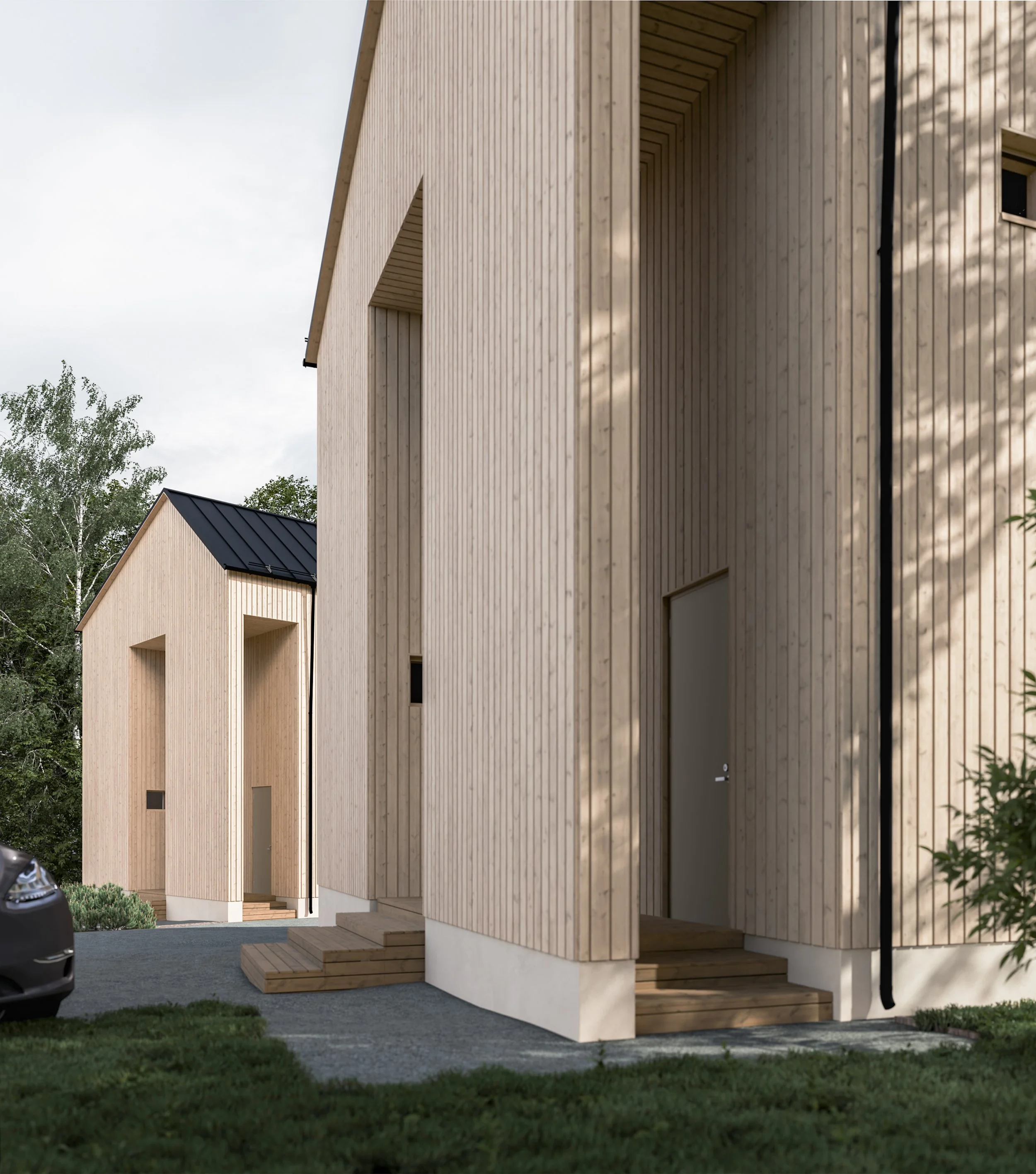 Kadun varteen sijoittuvat erillistalot ovat kaksikerroksisia ja tontin perällä sijaitseva on yksitasoinen. Talot on verhottu pystysuuntaisella harmaalla puuverhouksella. Harjakattoiset, kapearäystäiset rakennukset on sijoiteltu niin, että kaikista asunnoista avautuvat näkymät valoisiin ilmansuuntiin, ja omat piha-alueet ovat toisistaan hieman erillään.